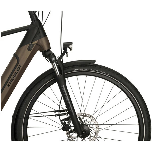 Sur ce modèle, on retrouve également des freins à disque hydrauliques Tektro mordants, pour un bon contrôle du vélo et une sécurité supérieure. Un éclairage complet, un carter de chaîne, des garde-boues, un porte-bagages, des poignées ergonomiques et une béquille réglable complètent même la très belle panoplie du Kreidler.
