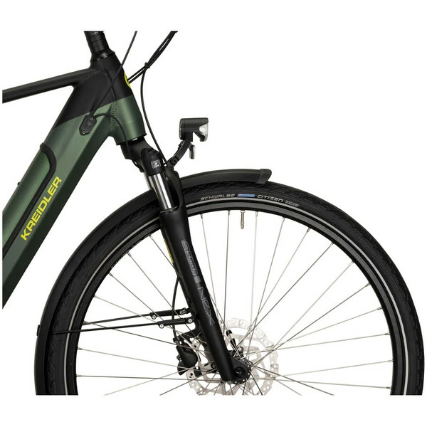 Sur ce modèle, on retrouve également des freins à disque hydrauliques Shimano MT200 mordants pour un bon contrôle du vélo et une sécurité supérieure. Un éclairage complet, un carter de chaîne, des garde-boues, un porte-bagages, des poignées ergonomiques et une béquille réglable complètent même la très belle panoplie du Kreidler.