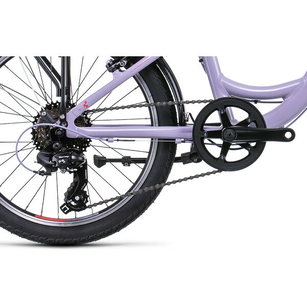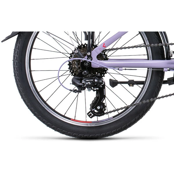 La transmission Shimano 7 vitesses offre un changement de vitesses fluide et fiable. Enfin un porte-bagages est intégré et des garde-boue permettent aux jeunes cyclistes toujours rouler avec des vêtements secs et chauds même quand les routes sont trempées.