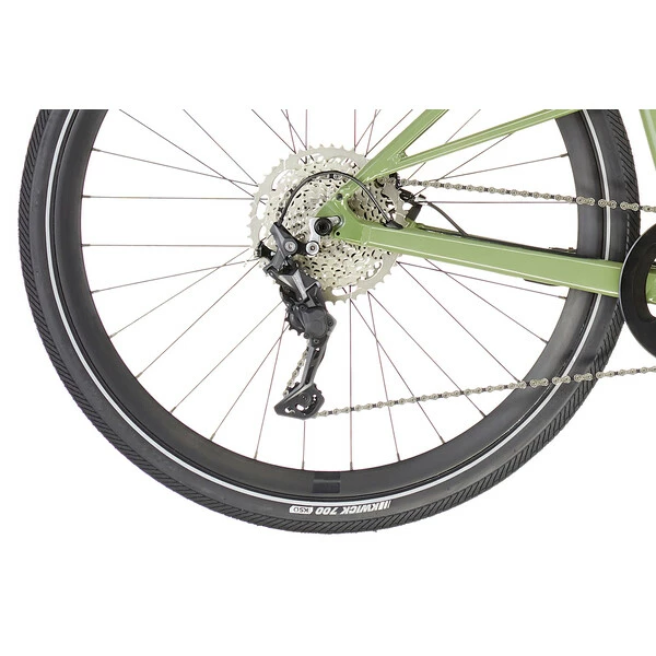 Il est conçu autour d’un cadre en aluminium et une fourche carbone garantissant à la fois un grand confort et un bon rendement. Côté assistance électrique, le Vibe combine une batterie de 248 W dans le down tube et reçoit un moteur Ebikemotion intégré dans le moyeu de la roue arrière. Le cœur du Vibe, le moteur du moyeu arrière est l’élément clé du concept Enough Power. Le système moteur sophistiqué fournit une assistance souple et fiable suffisante selon des niveaux prévus pour faciliter votre pédalage, rendre vos sorties plus accesibles sans que ce ne soit trop facile. De plus, le moteur se trouvant dans le moyeu, vous profiterez d’un pédalage sans résistance lorsque le Vibe ne fournit pas d’assistance. L’algorithme sophistiqué de simulation de couple du Vibe calcule votre puissance transmise aux pédales pour appliquer davantage de puissance quand vous l’attendez et conserver l’énergie quand vous roulez facilement. Par ailleurs, il est possible de connecter son vélo à son smartphone avec l’application Ebikemotion afin d’avoir un panel d’information très complet. Ajoutez un support pour votre téléphone portable et repérez-vous facilement dans les rues grâce au système de navigation et aux cartes hors ligne inclus.