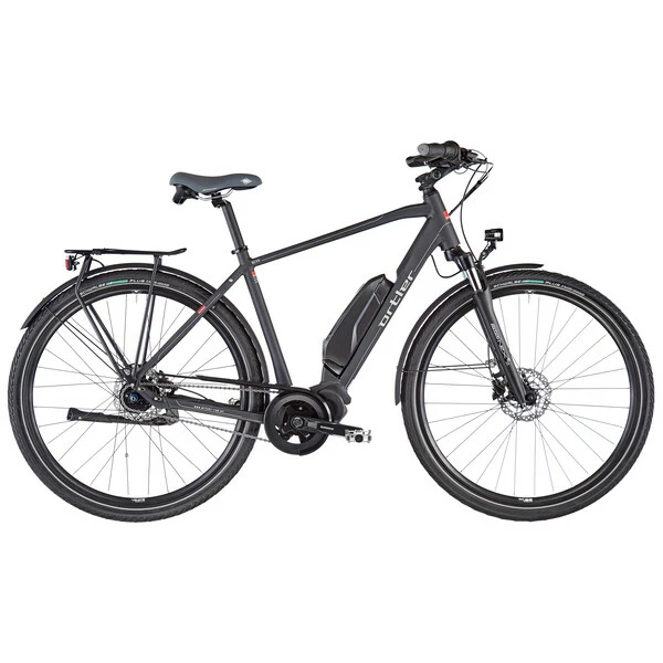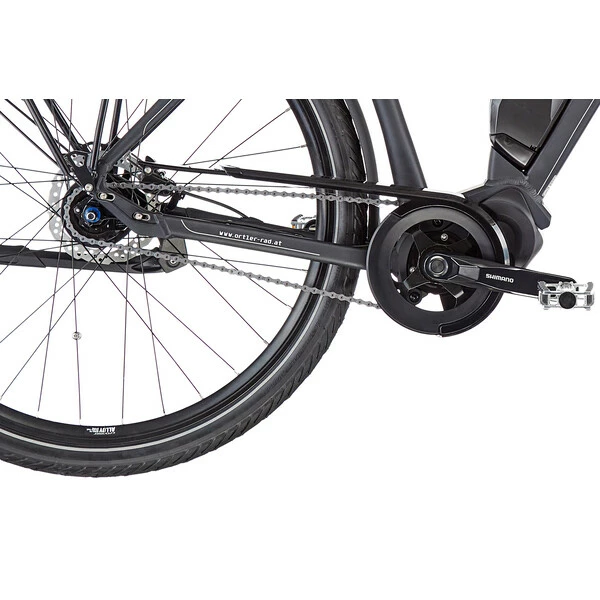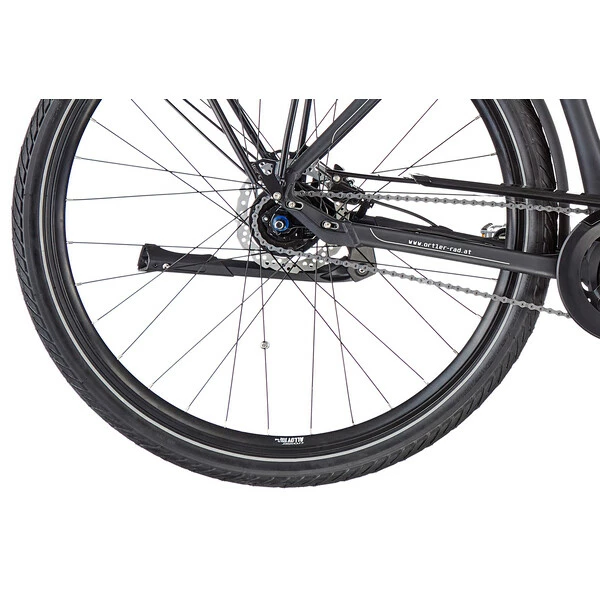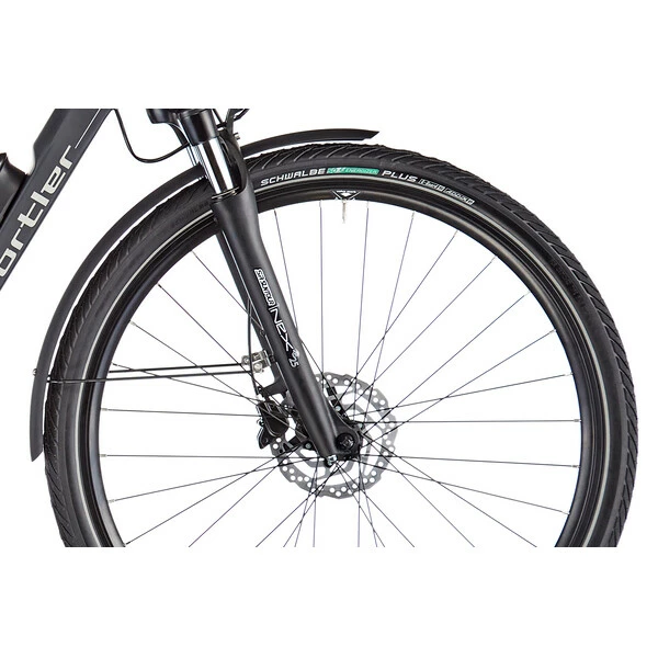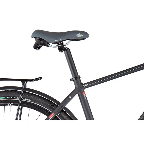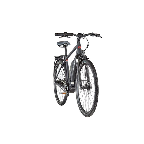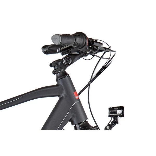 Le vélo est équipé d’une transmission à moyeu intégré Shimano Nexus 7 vitesses à rétropédalage, remarquablement simple et pratique d’utilisation. À ces composants de grande qualité s’ajoute un équipement complet pour la randonnée, comprenant un porte-bagages, une béquille, des garde-boues et des feux avant et arrière. Le confort est également au rendez-vous puisque ce vélo est doté d’une fourche suspendue, d’une selle Royal moelleuse et d’une potence réglable.